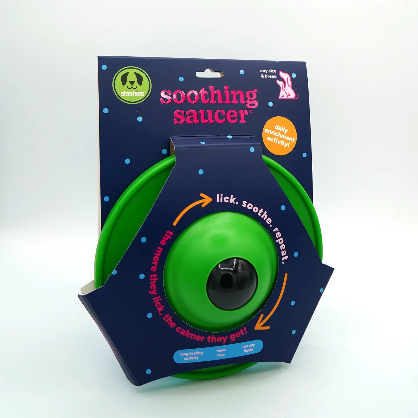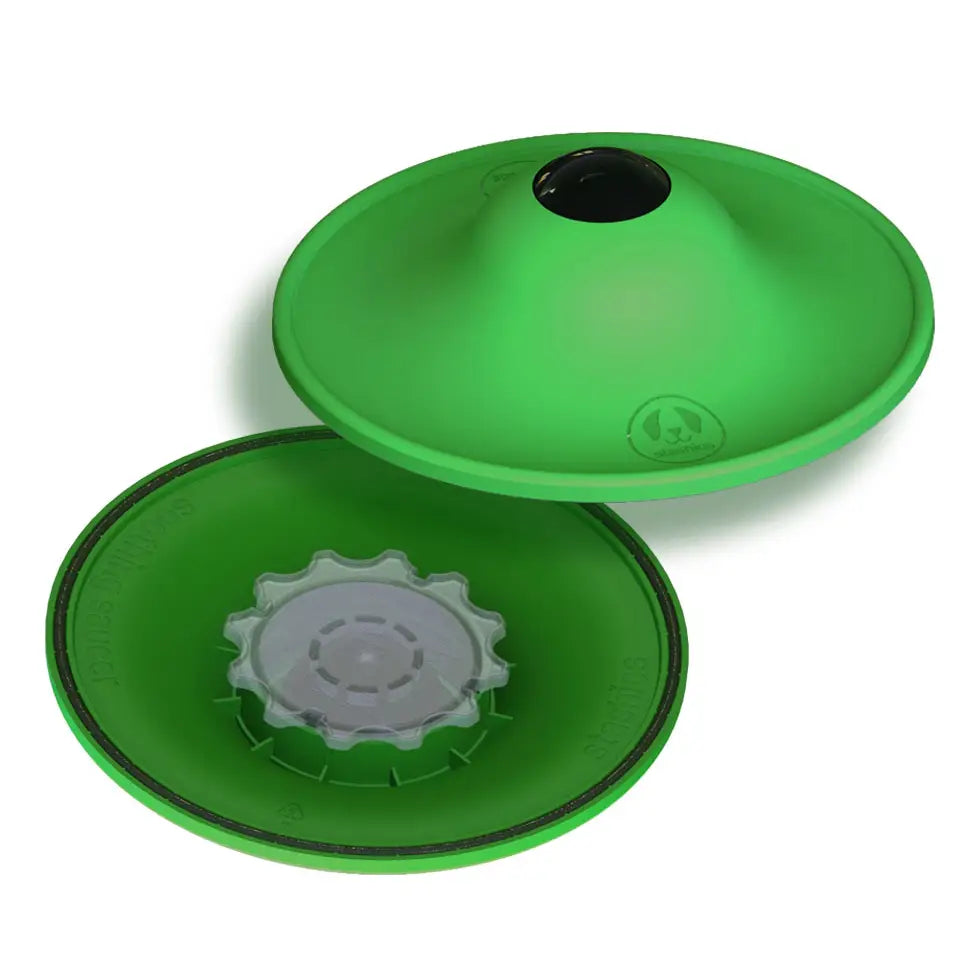 Licking can be self-soothing when a dog feels nervous, anxious, or bored. The Stashios Soothing Saucer®’s patented design promotes licking and helps reduce feelings of stress and anxiety. Use with Stashios Soothing Sauce® for additional benefits. -Rolling ball dispenses Soothing Sauce -Tension on the ball can be adjusted by loosening or tightening the bottom cup Includes: 1 Soothing Saucer
