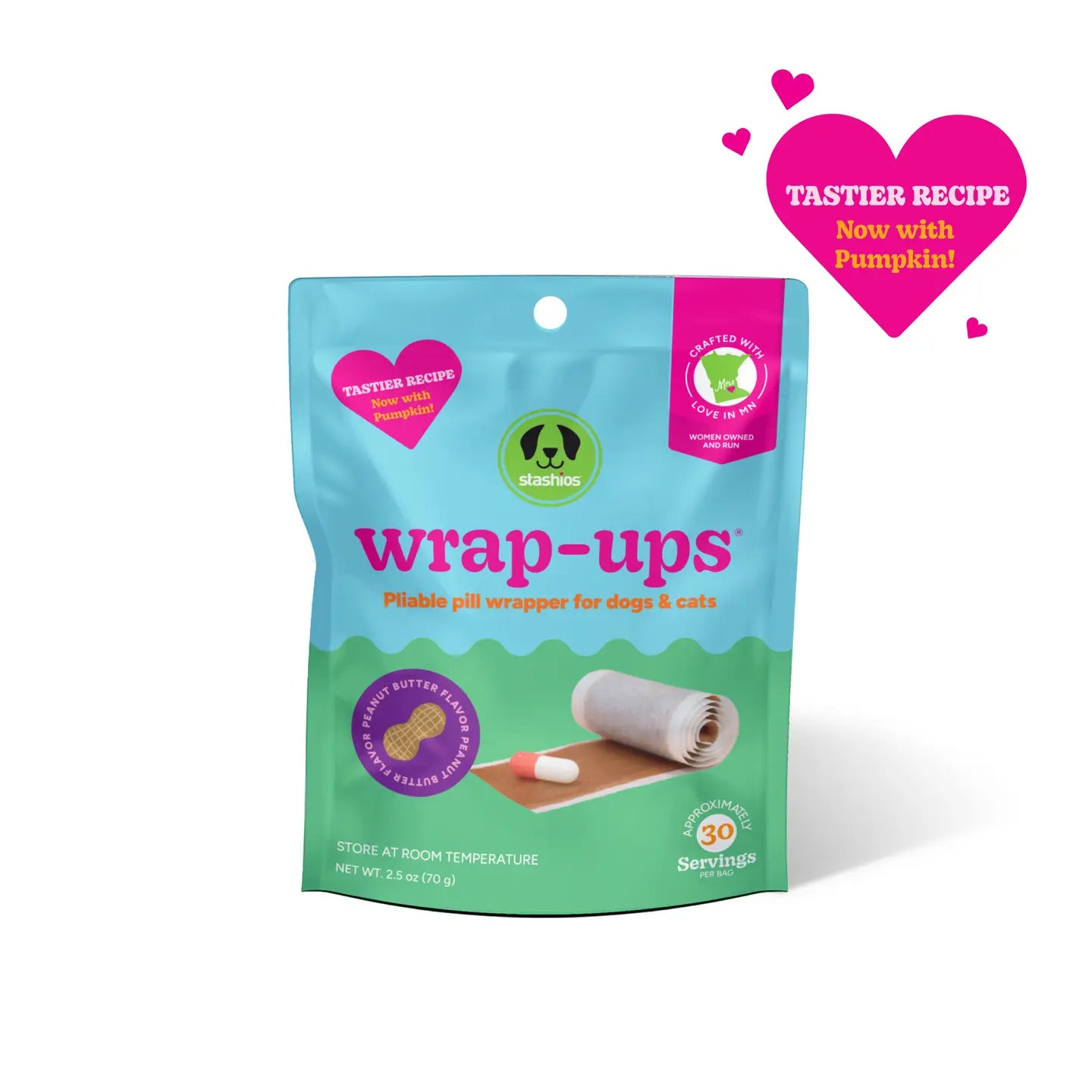 Stashios Wrap-Ups® are pliable, edible pill wrappers that can be used to hide any size and shape of pill, capsule or tablet. Wrap-Ups were created for dogs, making it easier for people to feed medication to their pets. With Wrap-Ups, you can transform a pill into a treat. -Simply TEAR off desired amount, WRAP around pill, and SERVE to your pet.